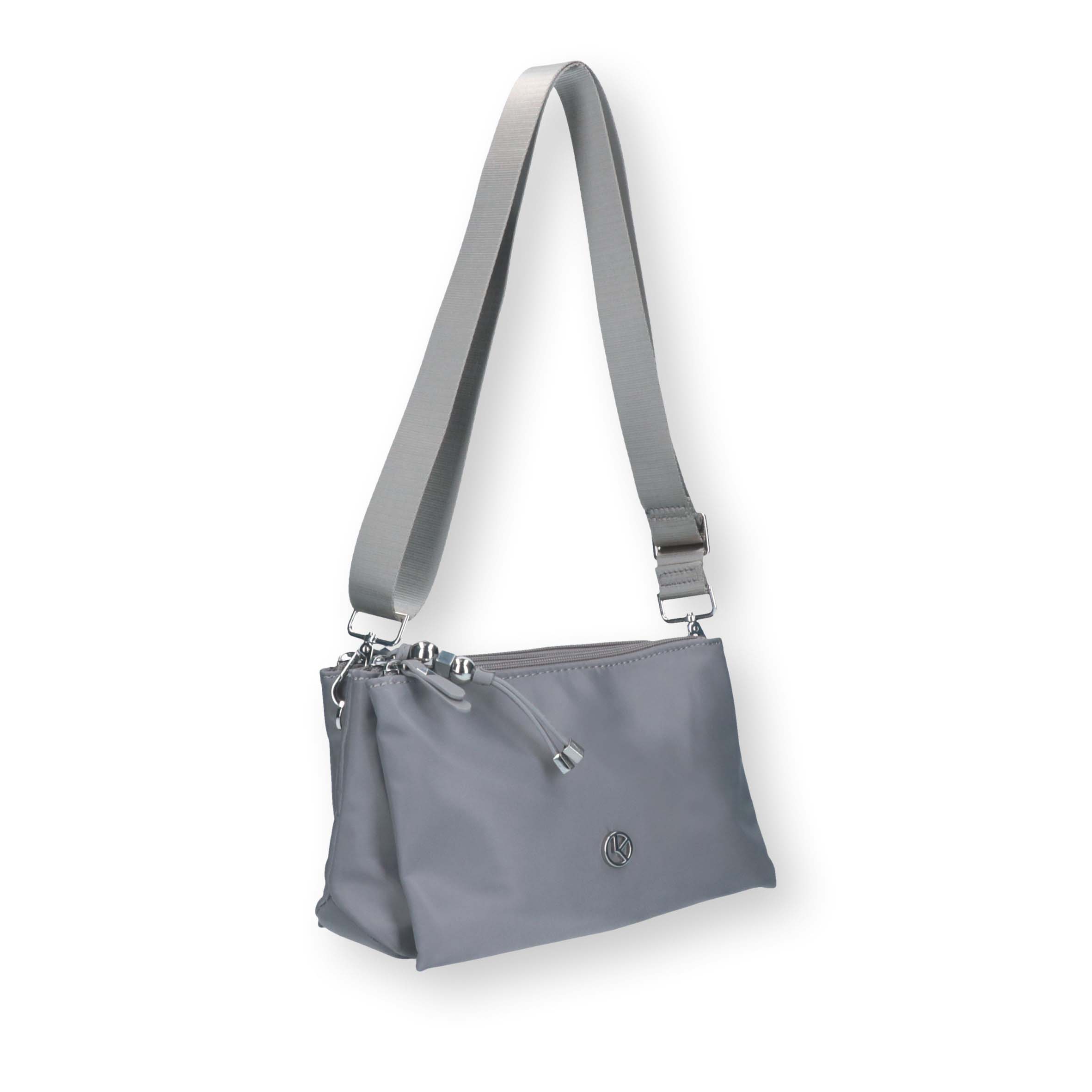 Borsa a tracolla in nylon antistrappo dotata di tracolla di nastro regolabile.  Presenta tre comode tasche con zip a scomparsa, all’interno fodera in tono, tasca portacellulare e taschina chiusa con zip.